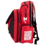 Realizzato in nylon resistente, con loghi stampati, imbottitura posteriore in mesh, cursore in gomma con cerniera, 2 ampi scomparti principali con numerose tasche accessorie, tasche imbottite per occhiali da sole e tablet e tasca esterna per bottiglie.